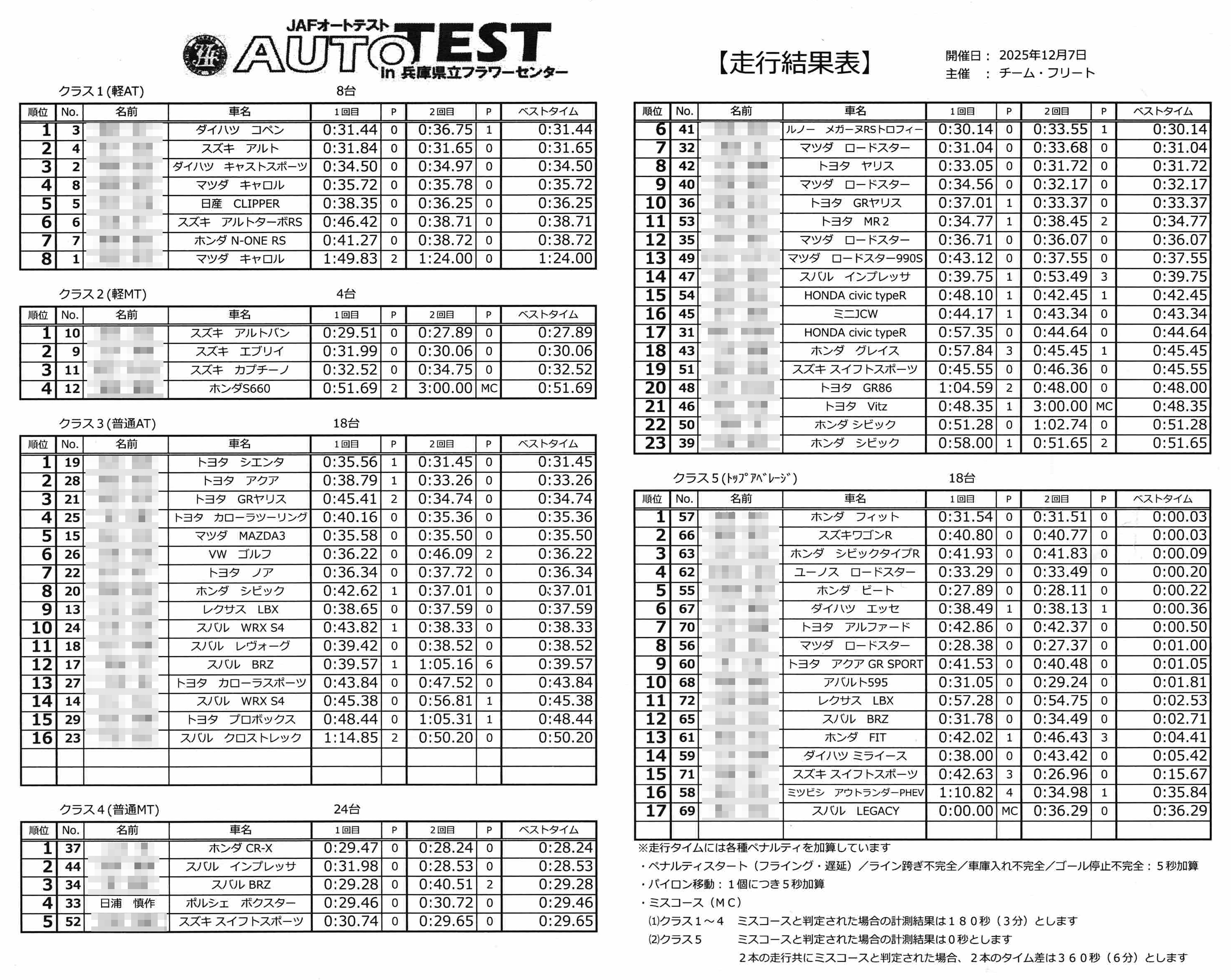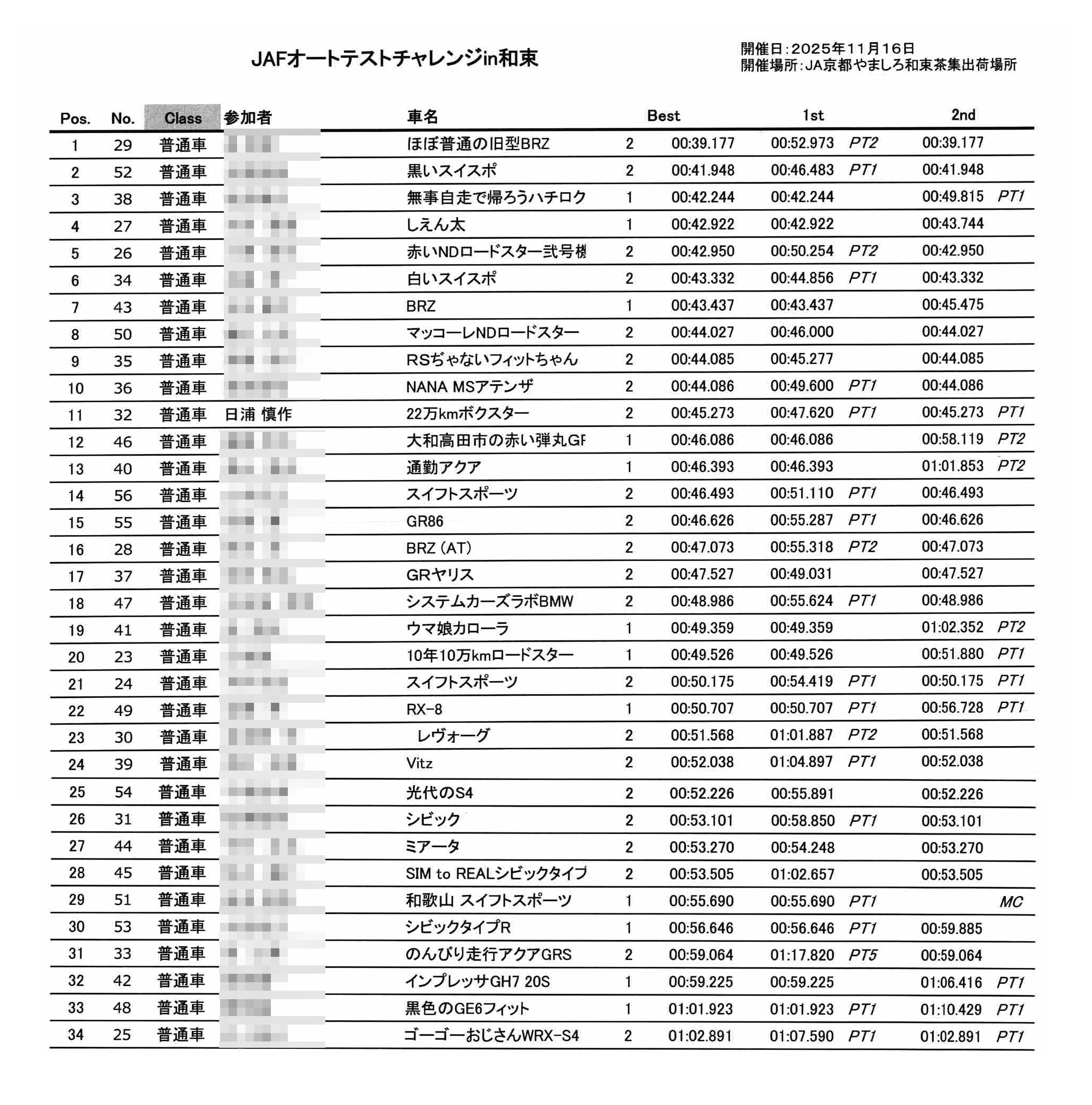 リザルトです。「オートテストプラス」のクラスは強豪揃いで、実際、大半が知り合いの方です。その中で、今回の条件で11位は、満足ではないにしても頷ける内容でした。