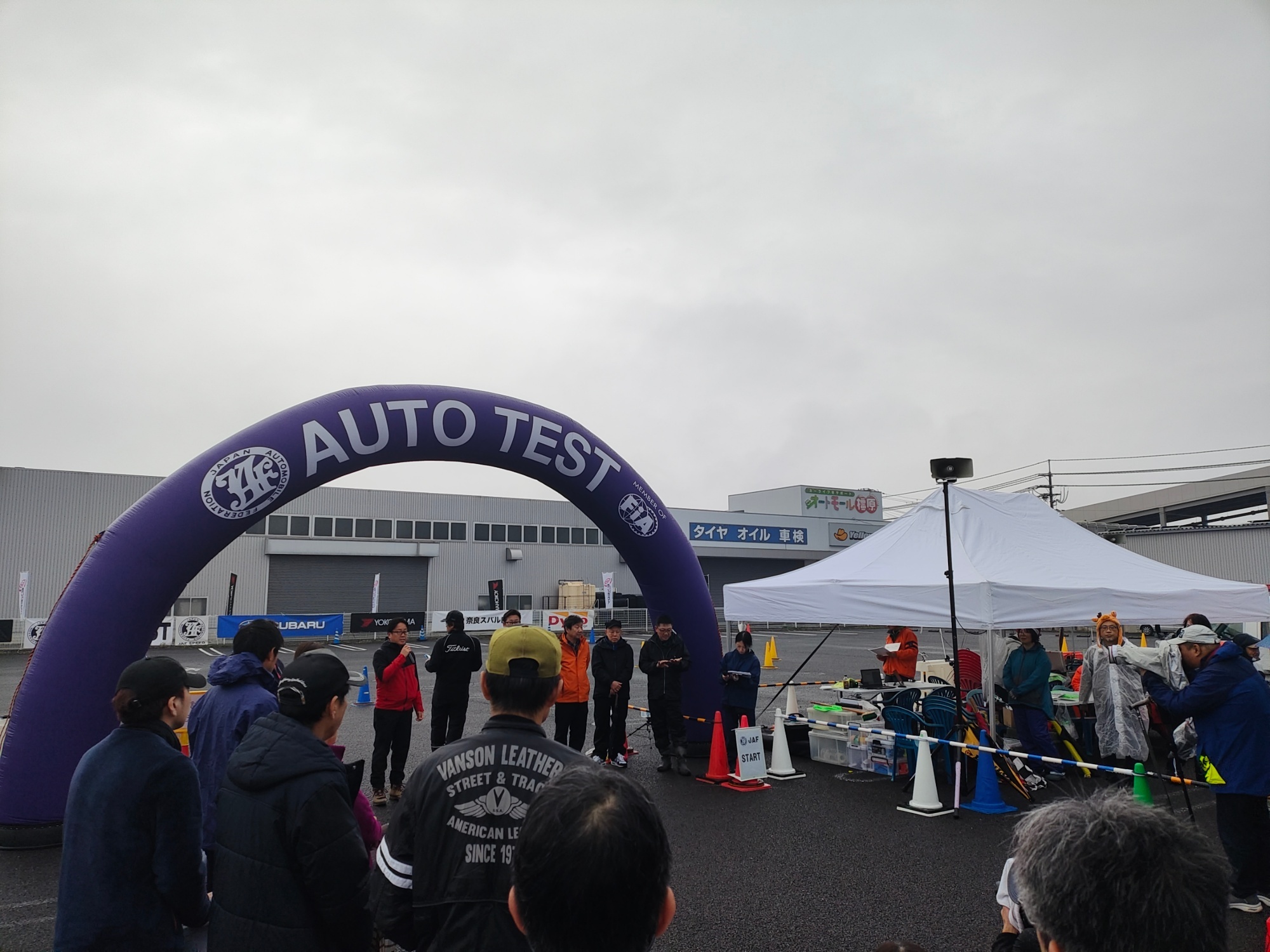 昨日(土曜日)は季節外れの温かい気候だったのに、オートテスト当日は雨。この写真ではまだ路面が少し濡れているぐらいですが、自分が走行する頃には本格的な雨になり、コースにも水たまりができる状況。今回も軽自動車が上位に位置する小型車有利なコース設定だったことに加え、雨でさらにパワーが不要になり、自分の車ではひたすら我慢、のちょっとストレスの溜まる走りを強いられる競技になりました。
