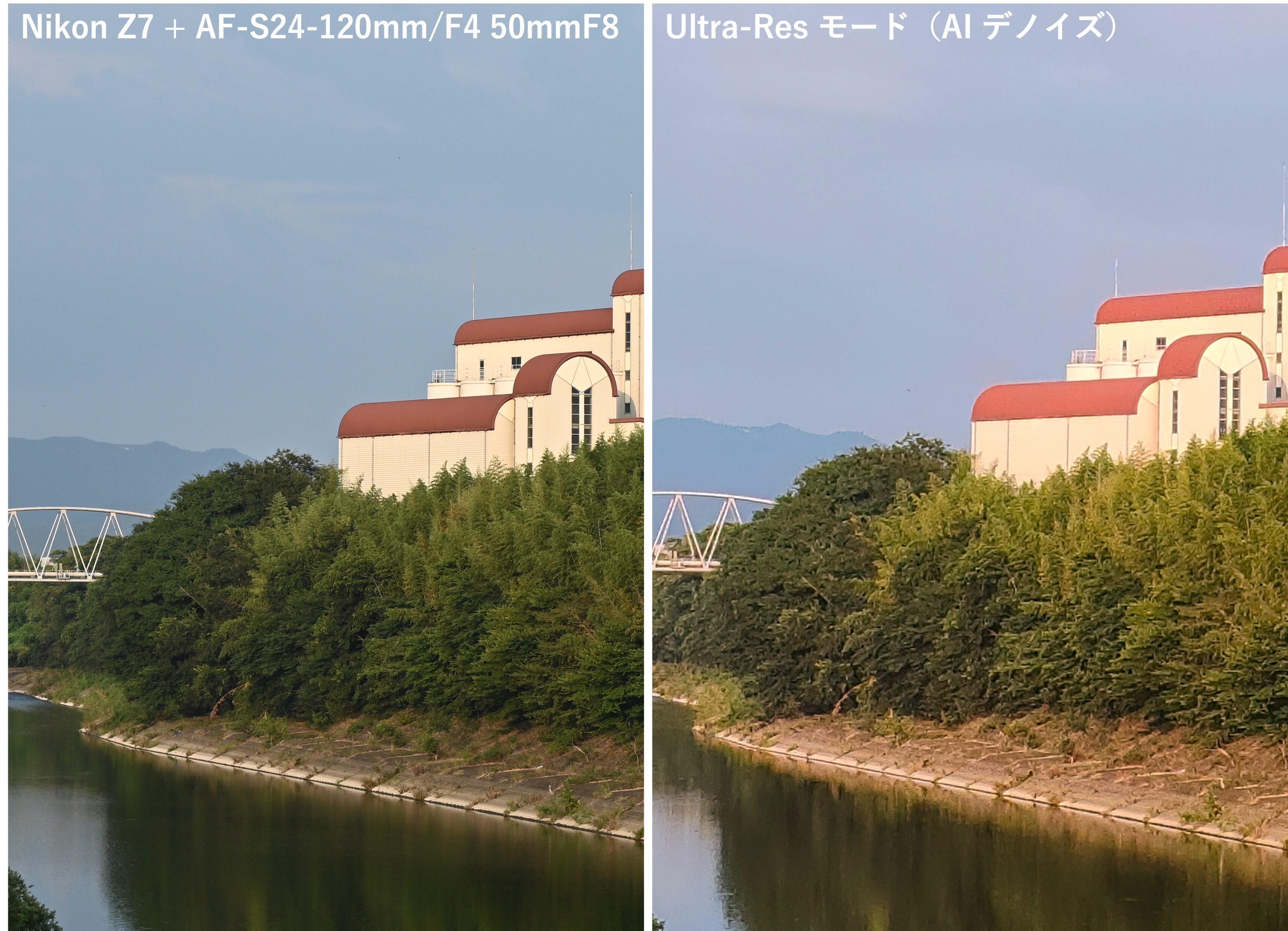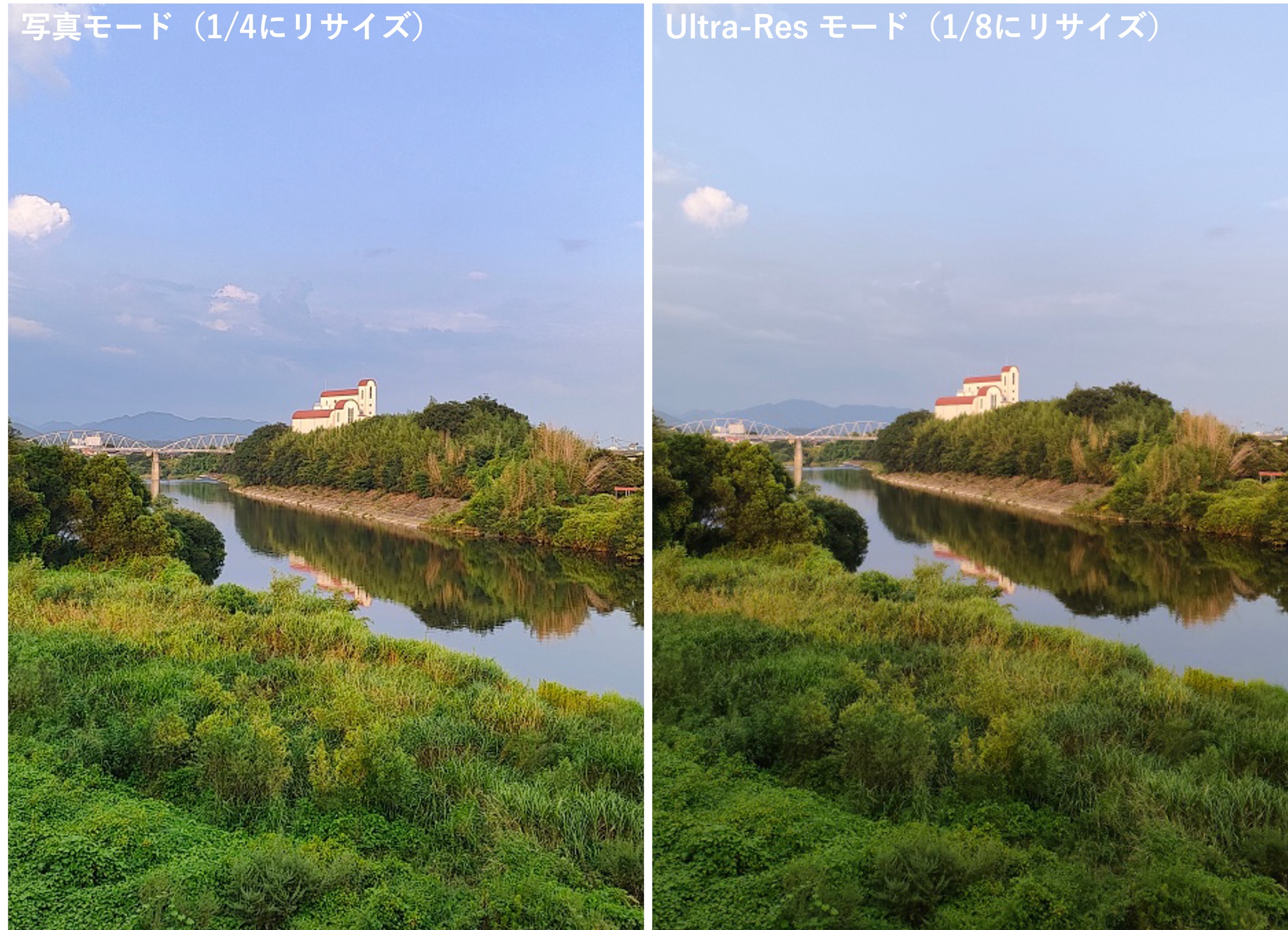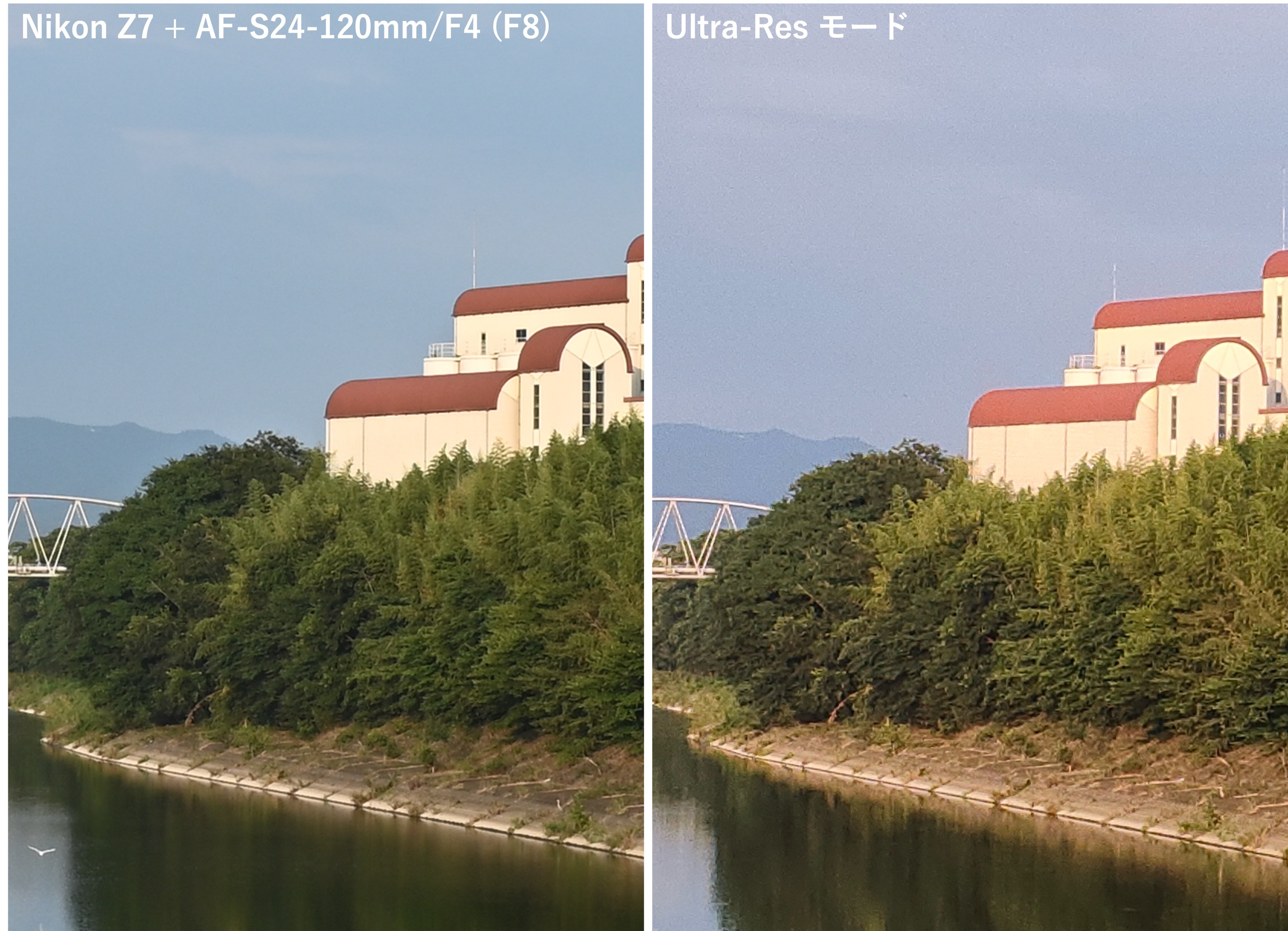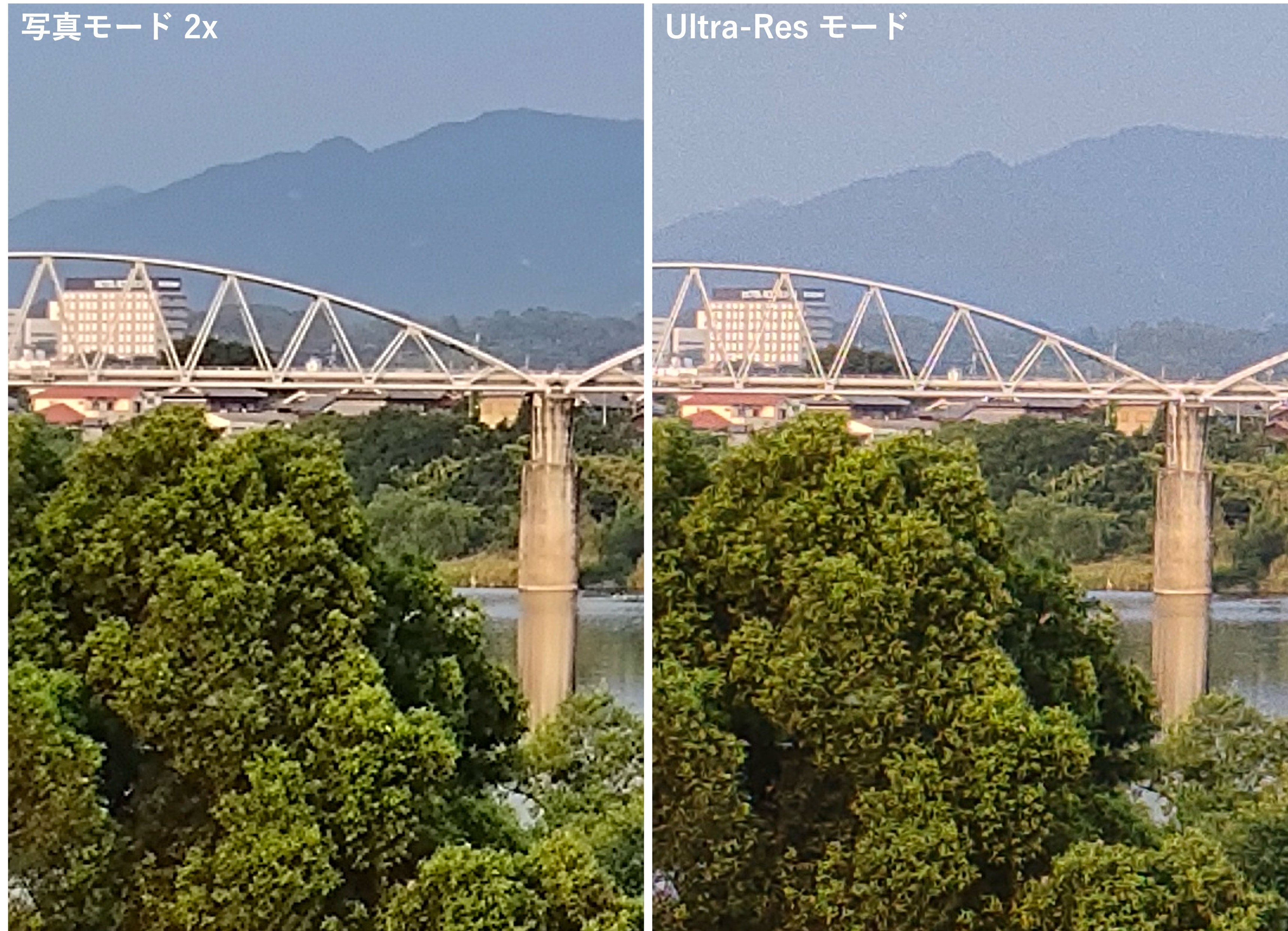 この写真は同じ倍率で違う場所を拡大したものです。大きく拡大して観察すると、橋のトラスが写真モードではギザギザしてしまっていますが、Ultra-Resモードでは滑らかで自然です。山の稜線も、通常モードでは稜線の縁に薄く黒線を引いたようになっているのが、Ultra-Res モードでは自然です。ほかにも手前の木々の描写も、Ultra-Resモードのほうが繊細さを感じさせるものになっています。