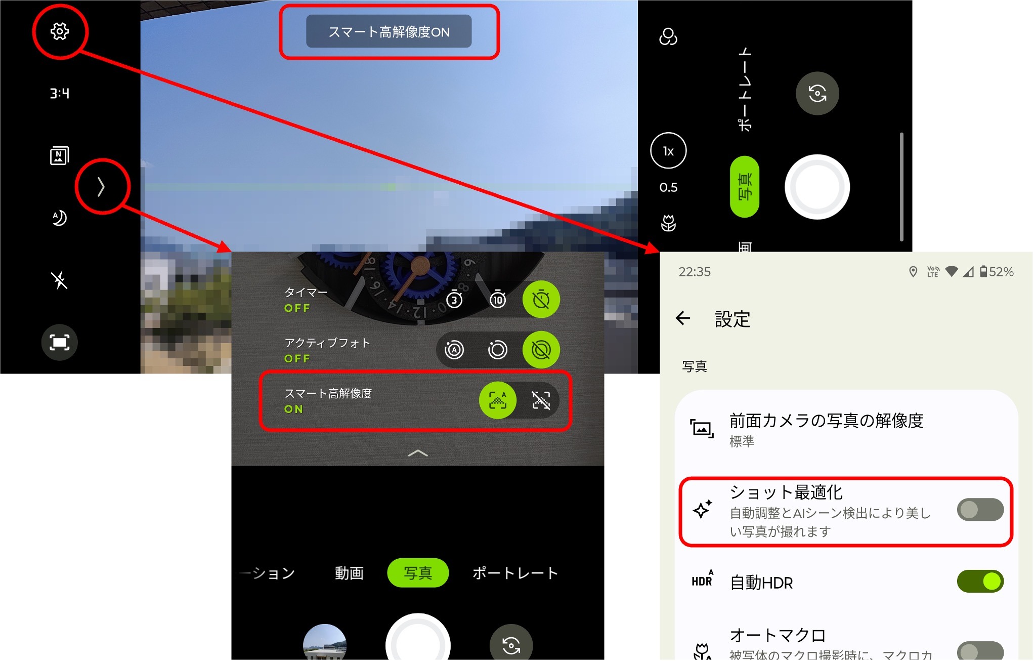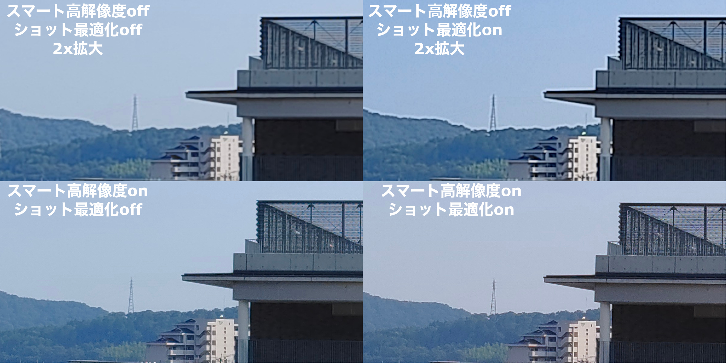 次は、冒頭に述べた「スマート高解像度」と「ショット最適化」の設定の影響について調べてみます。