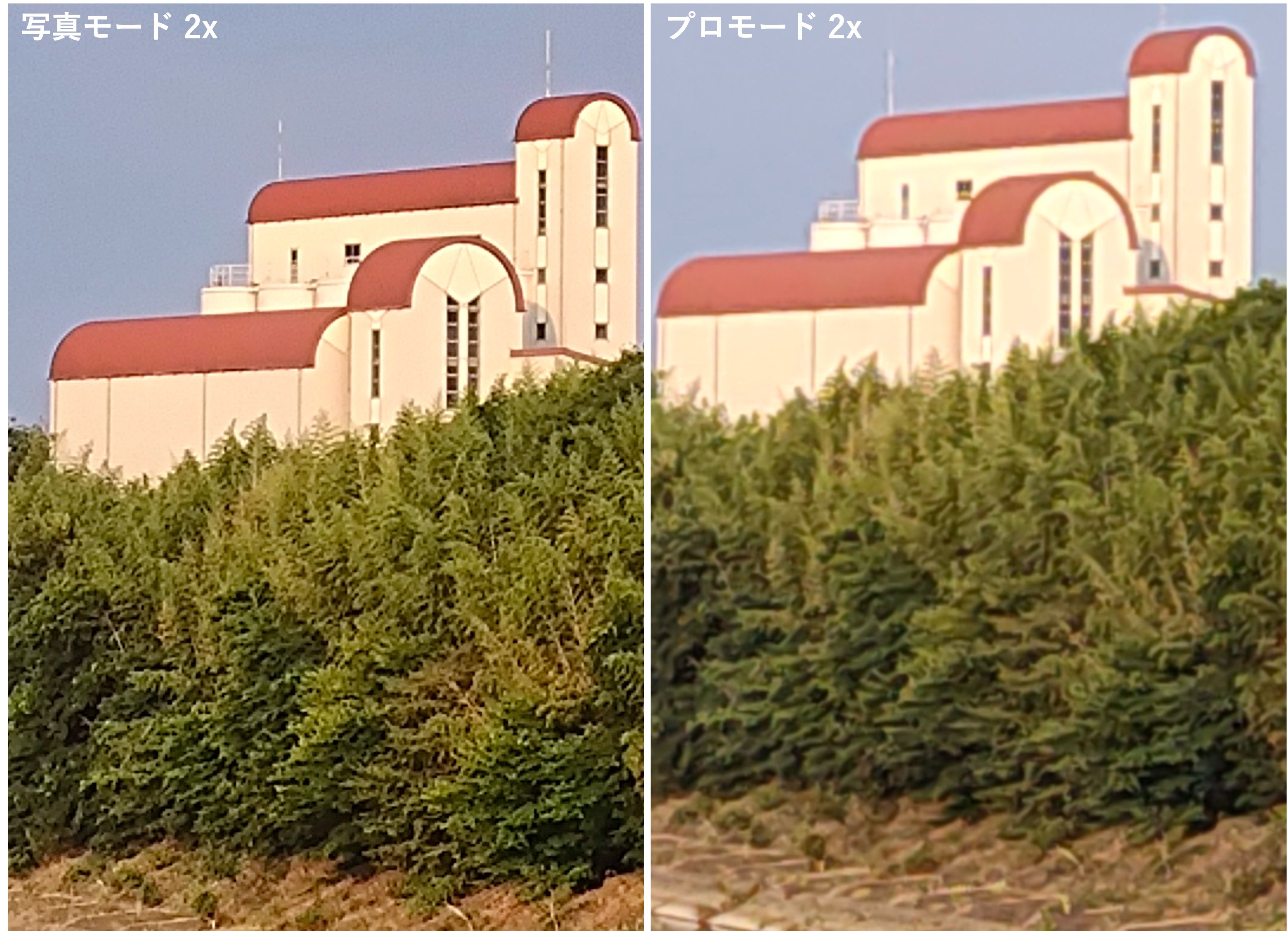 まずプロモードですが、こと解像感に関して言えば問題ありです。写真モード(通常モード)ではデジタルズームを使ったときに全画素読み出しモードに切り替わるのに対し、プロモードはビニング読み出し固定になっており、デジタルズーム時の解像感が明確に低くなってしまいます。上の写真は写真モードとプロモードで、2xデジタルズーム時の中央付近を切り出したものです。最近のスマホはこのように全画素読み出しとビニング読み出しを切り替えることで、デジタルズーム時の画質低下を抑制するようになっていますが、これが働かないのは致命的です。