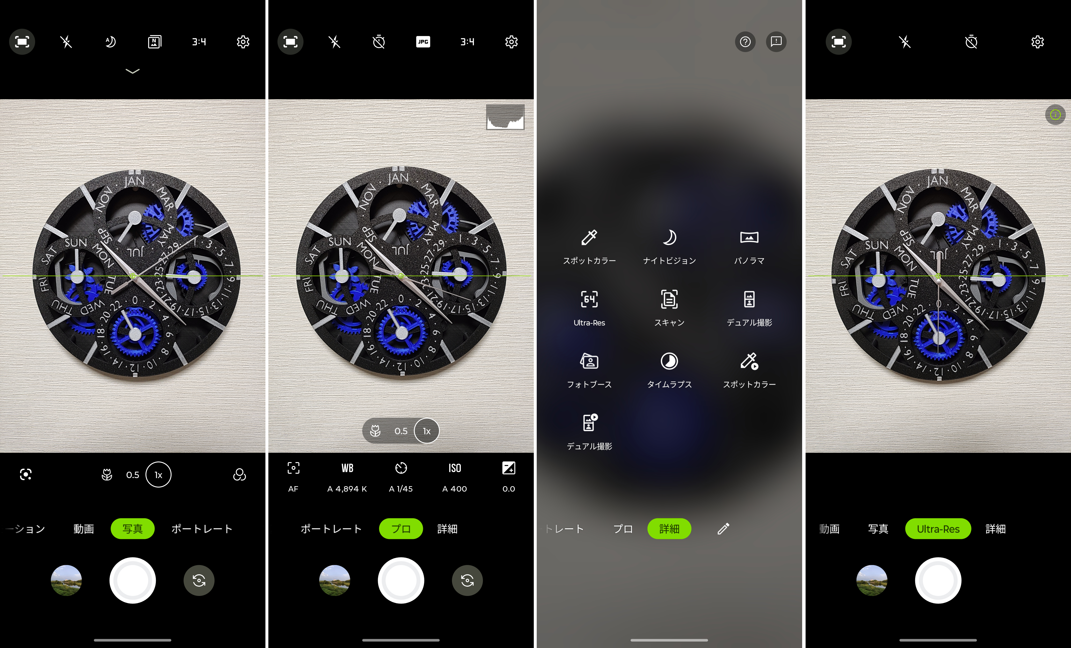 ほかにも、 Ultra-Res モードは色調やコントラストが自然で(写真モードでも「ナチュラル」設定にしていますが、それでも鮮やかさが強調されます)、いわば「一眼デジカメで撮ったよう」な落ち着いた印象があります。撮影した元画像はこちらにありますので、確認してみてください(各撮影モードはファイル名で分かるようになっています)。ノイズは少し増えますが明るい環境では問題になるほどではないし、縮小すれば弱くなります。さらに後処理で、例えば Topaz Photo AI のような高度なソフトウェアを用いると、スマホ内処理よりもずっと自然にノイズ除去ができます。Ultra-Res モードは画像サイズが9248x6936画素ととても大きく、ファイルサイズも24MB前後と大きくなってしまいます。こんな大きな画像が必要になることはまずないので、スマホ内に「Ultra-Resモードで撮影し、その結果を1/2に縮小する」モードがあればよかったとは思いますが、縮小しない画像が保存されるということは、デジタルズームの代わりに、あとから切り出し(クロップ)が使えるというメリットにもなります。