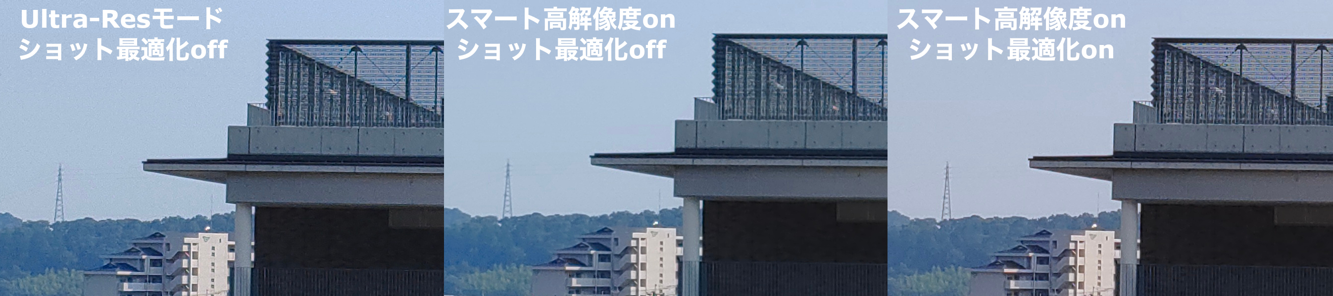 なお Ultra-Res モードではショット最適化をon/offしても画質に変化はなく、このモードでは設定が無視されているようです。