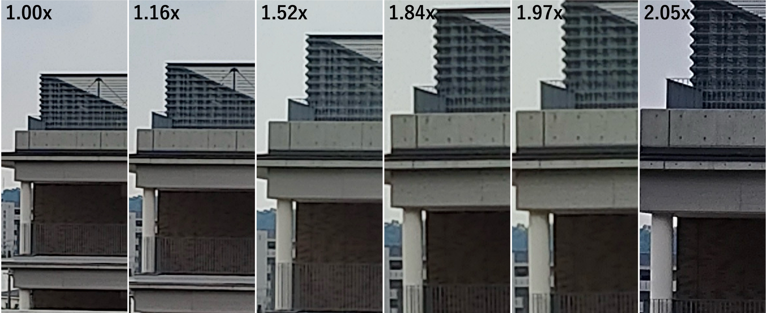センサから全画素読み出しして画像を生成し、それを縮小したら画質が高い、とするなら、デジタルズームなしの1x撮影でもそうやって動いてくれればいいとは思うのですが、そうはなっていません。暗所でのノイズ耐性を考えるとやむを得ないところでもあります。それでは、何倍から全画素読み出しに切り替わるのでしょうか。1.1倍ぐらいから切り替わるのであれば、ちょっと面倒だけれども、少しだけズームアップして撮影するという手が使えます。そこで確かめたところ、残念ながら2倍を超えてから初めて全画素読み出しに切り替わるようでした。上の写真では、1.97倍と2.05倍の間で解像感が急に向上していることがわかります。この挙動から、2倍未満のデジタルズームで撮影するよりも、Ultra-Resモードを用いたほうが良い(切り出して縮小するほうがよい)ことがわかります。